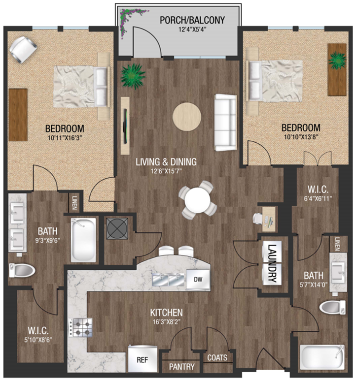 Choose from our one-, two, or three-bedroom floor plans that were designed with you in mind. Each home features a beautiful kitchen with granite countertops and stainless-steel appliances, in-home washer and dryer, private balcony, spacious walk-in closet, and premium finishes that combined, bring an upscale, sophisticated atmosphere.