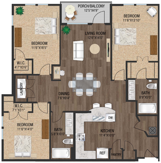 Choose from our one-, two, or three-bedroom floor plans that were designed with you in mind. Each home features a beautiful kitchen with granite countertops and stainless-steel appliances, in-home washer and dryer, private balcony, spacious walk-in closet, and premium finishes that combined, bring an upscale, sophisticated atmosphere.
